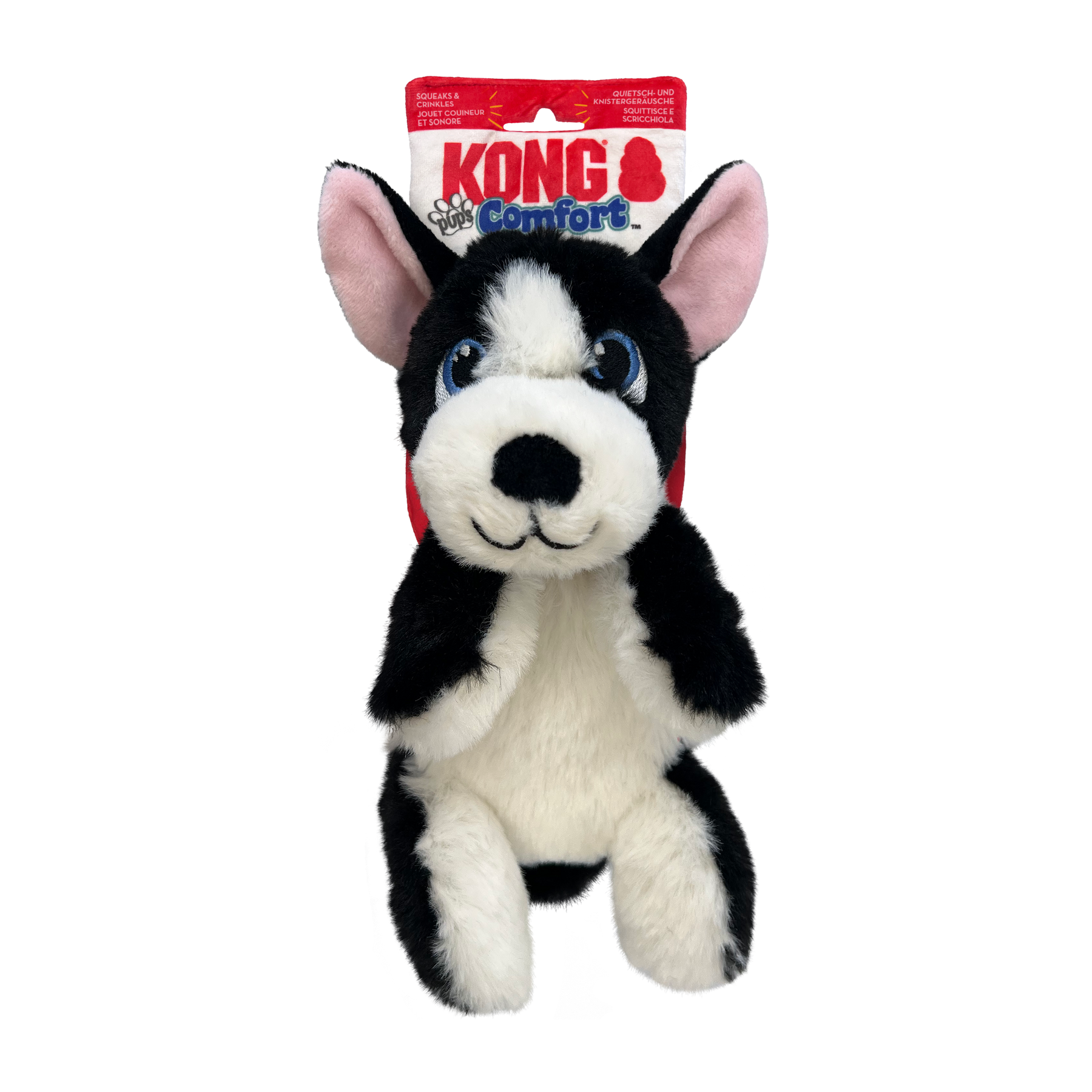 KONG Comfort Pups’ super-plush fur and floppy bodies make them ideal snuggle buddies for cuddling and fetching fun—plus, dogs can play with the crinkly, plush packaging! A squeaker and crinkly ears spark instincts and keep pups playing while the adorably floppy body makes shaking even more satisfying—with less stuffing for less mess.