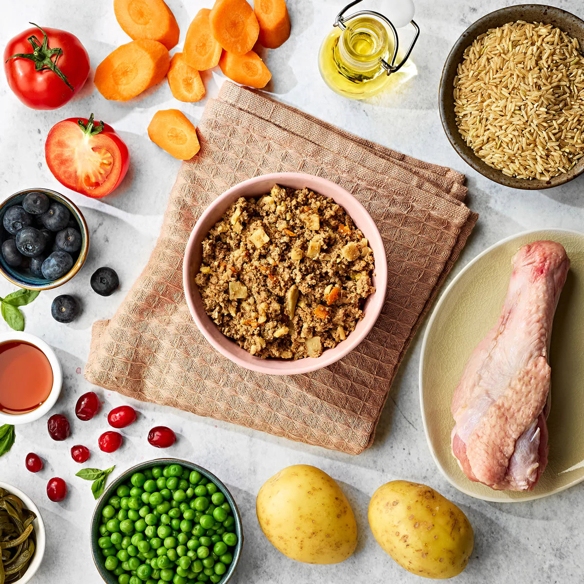 Natural wet food for small breed dogs, made with 60% turkey, rice, and vegetables. Gently steamed to support digestion, skin, and coat health.