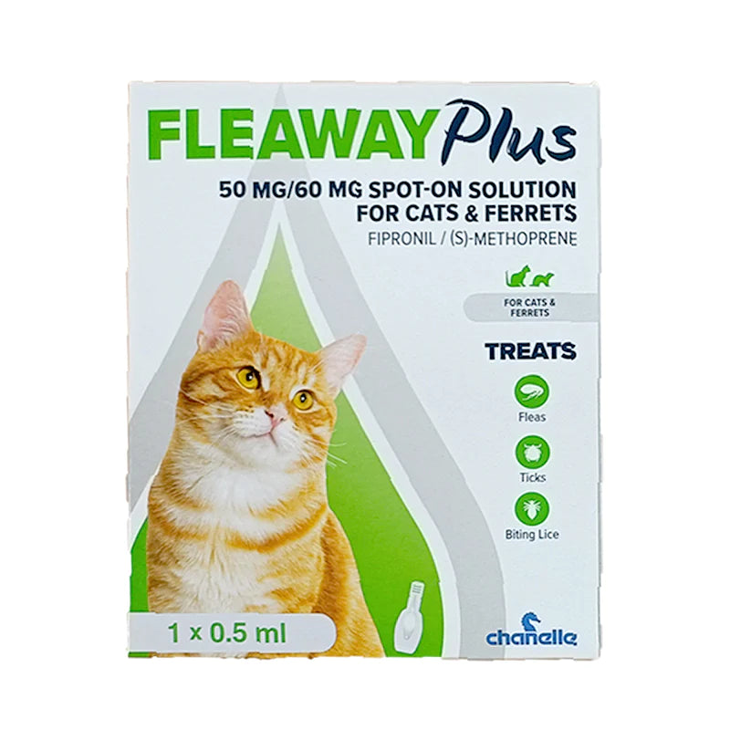 Give your cat or ferret lasting protection with Fleaway Plus Spot-On, a fast-acting and easy-to-apply treatment designed to kill and prevent fleas, ticks, and biting lice. Simply apply to the back of the neck where your pet can’t lick it off. The formula starts working quickly and continues to protect for up to 4 weeks.