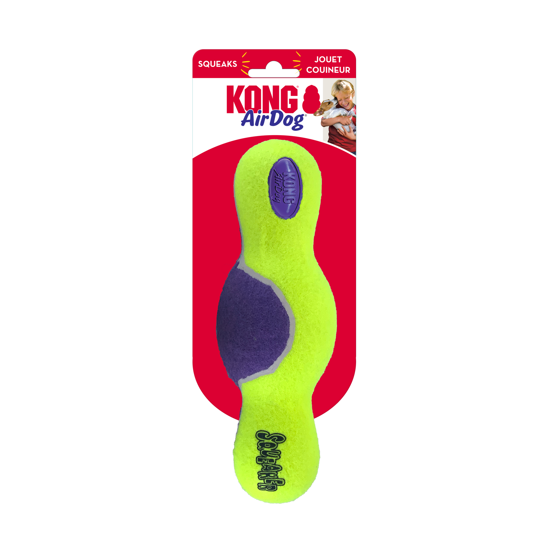 KONG AirDog Roller combines two classic dog toys the tennis ball and the squeaker to create the perfect fetch toy. Shape makes tossing and carrying easy for everyone. Ensures long-lasting fun while the non-abrasive, high-quality material is gentler on teeth and gums. Squeaker keeps the action-packed fun going for tons of healthy exercise.