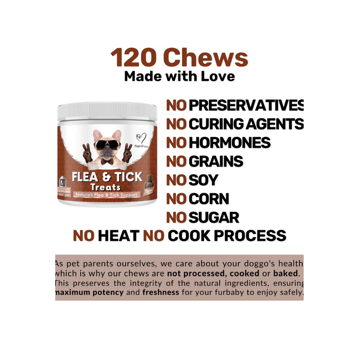 Protect your dog the natural way with Nutripaw Flea & Tick Treats. These soft, tasty chews are specially formulated with a powerful blend of herbs, vitamins, and essential oils known to naturally repel fleas, ticks, and other biting pests – without the harsh chemicals found in traditional treatments.