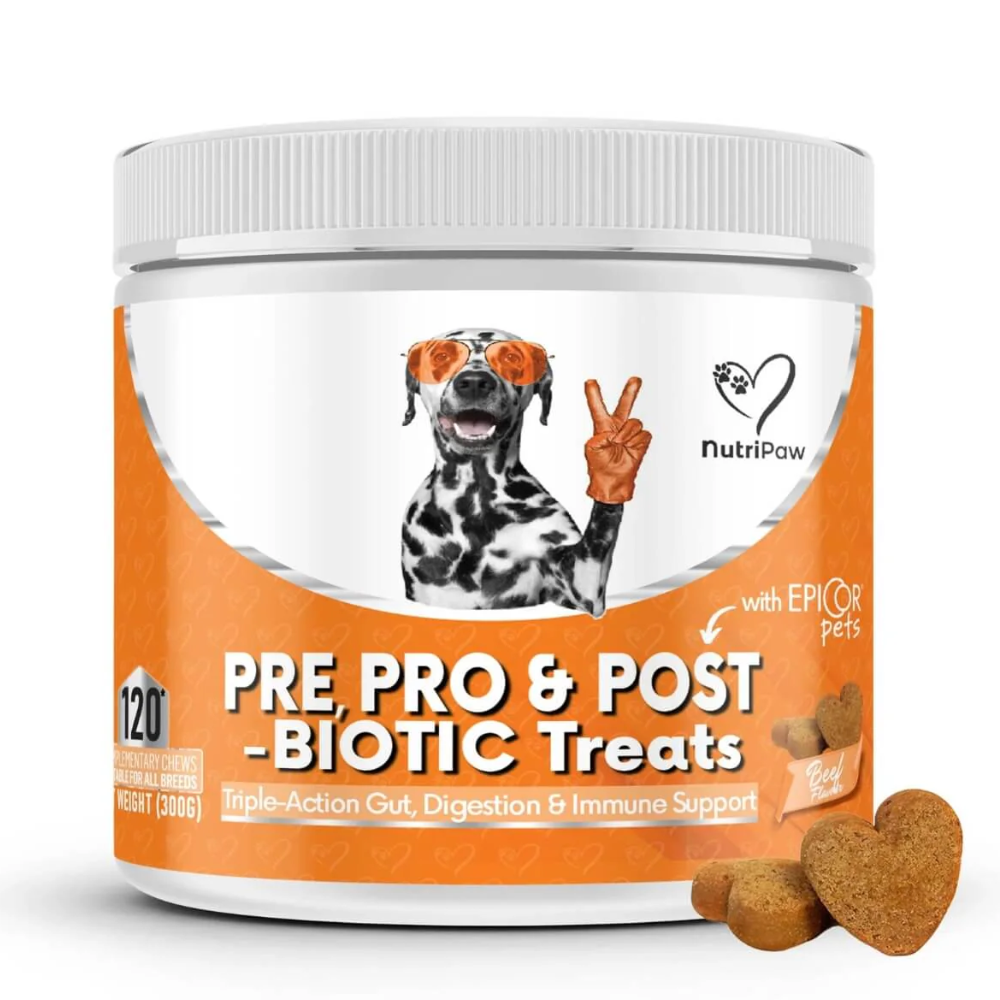 NutriPaw Pre, Pro & Postbiotic Digestive Treats are specially formulated to support your dog's digestive health, immunity, and overall well-being. These natural, grain-free chews combine a potent blend of prebiotics, probiotics, and postbiotics to promote a balanced gut microbiome, reduce digestive discomfort, and enhance immune function.