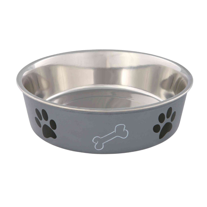 Stainless steel bowl with nonslip base and fashionable red paw and bone detail exterior