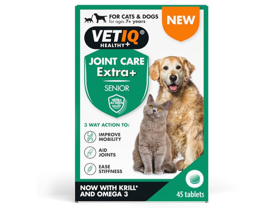 - VETIQ JOINT CARE EXTRA +: These Extra + Senior Tablets have been specially developed for older dogs 7+ who may be struggling with stiffness, mobility and muscle inflammation.